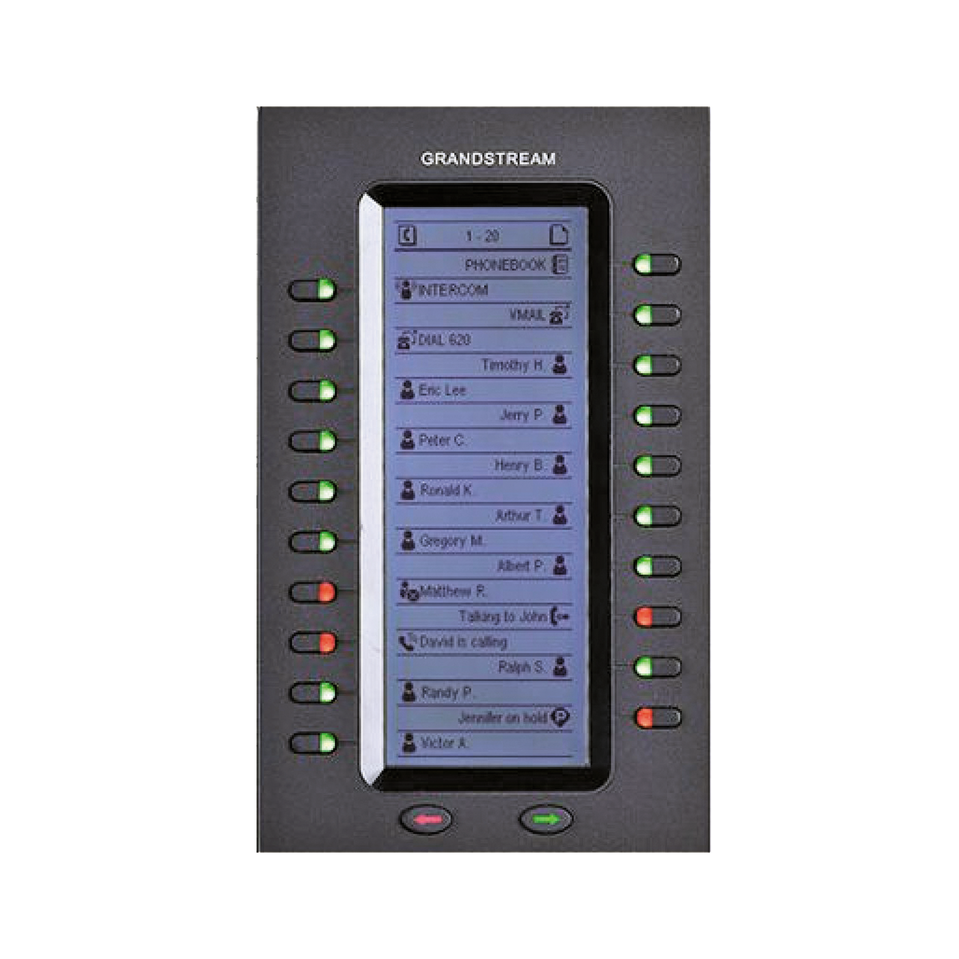 El módulo de extensión GXP2200EXT es soportado por el GXP2140, GXP2170, GXV3240 y GXP2200. El módulo incluye 20 teclas de extensión de dos colores y dos teclas de flecha para cambiar de página, permitiendo a cada GXP2200EXT contar con hasta 40 extensiones. Tiene una gran pantalla LCD retroiluminada para fácil visualización. Se pueden conectar hasta 4 módulos GXP2200EXT para tener un total de 160 contactos/extensiones.